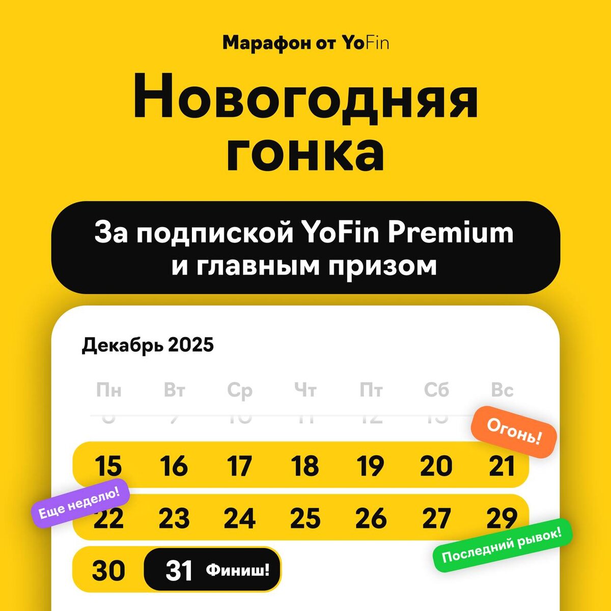 НОВОГОДНИЙ СПРИНТ НА YOFIN 🚀 Шанс залететь в 2026 на лучших условиях Год на финишной прямой. Самое время не сбавлять обороты, а сделать мощный рывок — и взять с собой в новый год эксклюзивные привилегии! Каждый день до конца декабря выполняйте три простых условия: ✔️ 3 заявки; ✔️ На общую сумму 3 млн; ✔️ Конверсия 30%. *Бонус: 3 заморозки максимум по 1 000 YFC за каждую. 🎁Награда за прохождение — подписка YoFin Premium на 3 месяца. Что входит: • Повышенное КВ от 3% до 5%; • Приоритетные выплаты и досрочные комиссии; • Доступ к сервису распознавания паспорта и бухгалтерской отчетности; • Подписка на сервис «Финансовый помощник»; • Приглашение на партнерские мероприятия YoFin; • И другие бонусы и привилегии 😉 🏆 Главный приз победителя — 150 тыс. руб. и торжественное награждение 12 февраля в ТПП РФ на Премии «Банки Года» в специальной номинации! Ваш @yofin