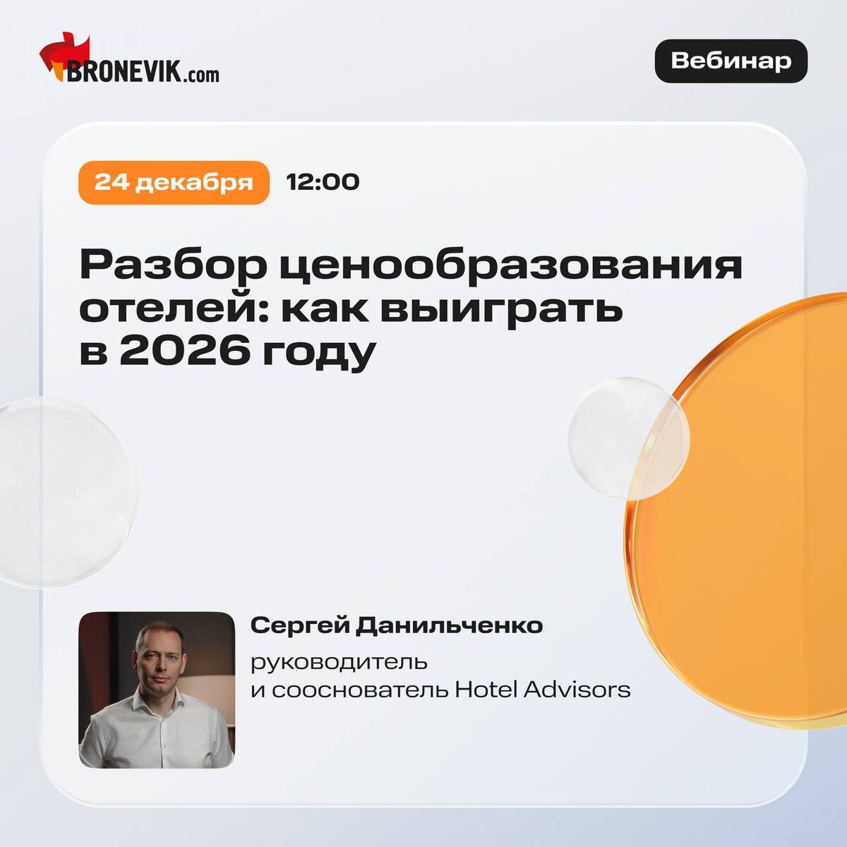 #новости_гостеприимства 🔴 Разбор ценообразования отелей с Сергеем Данильченко: как выиграть в 2026 году Конец года — идеальное время не только для отчетов, но и для стратегических решений, которые зададут тон всему следующему году. 📍24 декабря в 12:00 МСК мы проведем бесплатный вебинар, который станет вашим преимуществом на старте нового года. 🗣️ Приглашенный эксперт — Сергей Данильченко, руководитель и основатель Hotel Advisors, один из тех, кто на протяжении более 20 лет продвигает принципы Revenue-management, обучая отельеров. Специально для вебинара аналитики Bronevik.cоm собрали данные о динамике средней цены в 2025 году, а также о том, по каким ценам уже бронируют номера на 2026 год. 📍На основании этих показателей, а также данных Hotel Advisors, Сергей Данильченко поможет вам: ✔️ Сверить внешнюю аналитику с вашими внутренними данными по результатам 2025 года. ✔️ Сделать прогноз продаж вашего объекта размещения на 2026 год. ✔️ Выставить или скорректировать цены на 2026 г
