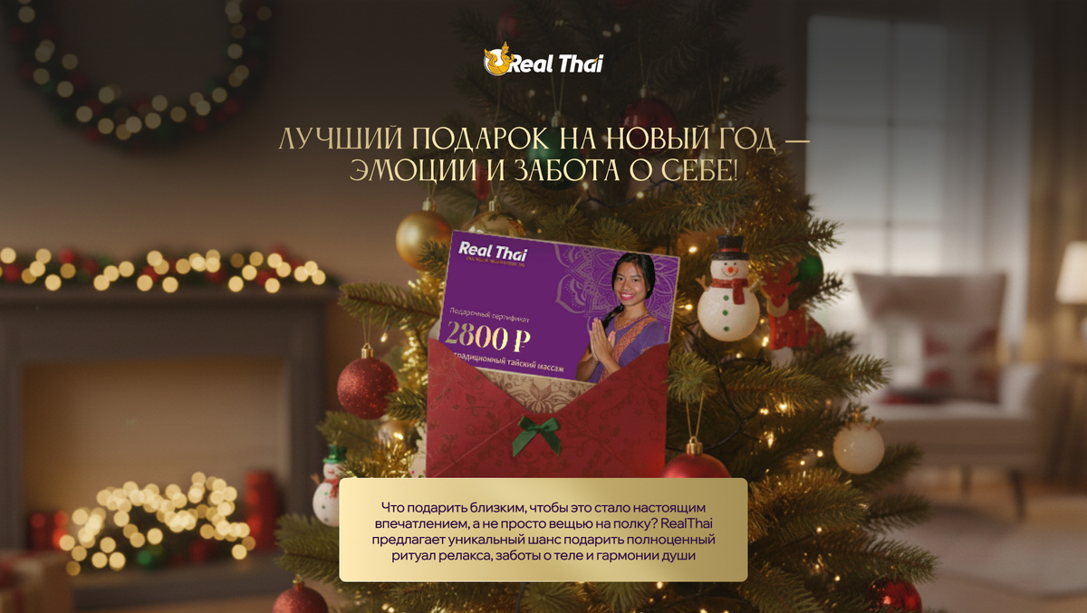 Вы когда-нибудь задумывались, что настоящий подарок на Новый год — это не вещь, а эмоции и впечатления, которые остаются надолго? В RealThai вы можете подарить близким уникальный опыт — тайский массаж или СПА-процедуру, которые помогут снять стресс, расслабить мышцы и восстановить гармонию тела и духа. Сертификат — это удобный и универсальный способ сделать подарок, который точно понравится. У нас есть два формата: Более 20 видов сертификатов позволяют подобрать подарок на любой вкус и бюджет: Когда вы в последний раз делали подарок, который дарил эмоции, а не вещи? Хотите ли вы, чтобы ваш подарок действительно помог близким расслабиться и восстановиться? Подарочные сертификаты RealThai — это не просто подарок, это час заботы, релакса и гармонии, который останется в памяти на долгое время. Это возможность подарить своим близким уникальный опыт тайского массажа и СПА-процедур, который помогает снять стресс, улучшить самочувствие и зарядиться положительными эмоциями.