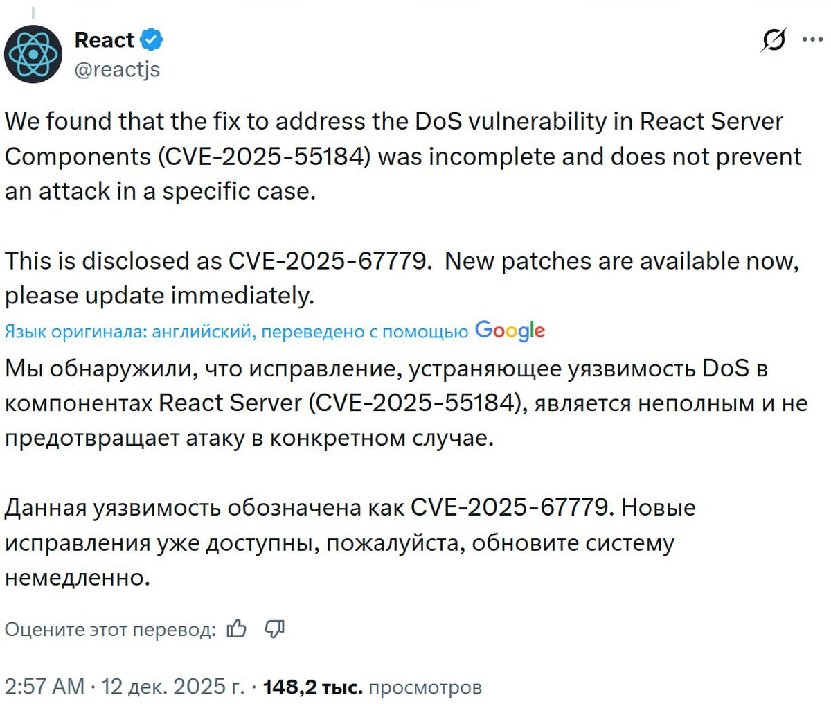 Наши проекты частично написаны на ReactJS. Помните, недавно нашли дыру в безопасности? Поправили и бумс, оказывается не до конца. В общем если используете React, то посмотрите на картинке и залейте новые патчи, дабы вам проект не положили плохи парни ... Русский ИТ бизнес