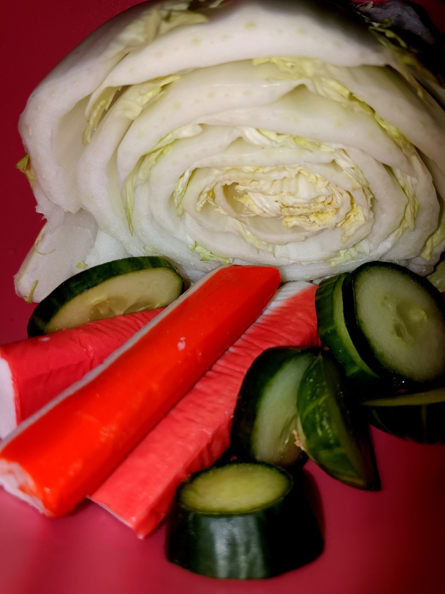 Она выложила капусту на стол — тонкие листья с мягкими жилками, как карта с дорогами, ведущими туда, где не была. Крабовые палочки лежали ровными колоннами в своей пластиковой коробочке; в их аккуратности было что-то смешное и надежное одновременно. Огурец — прохладный, как речная галька.