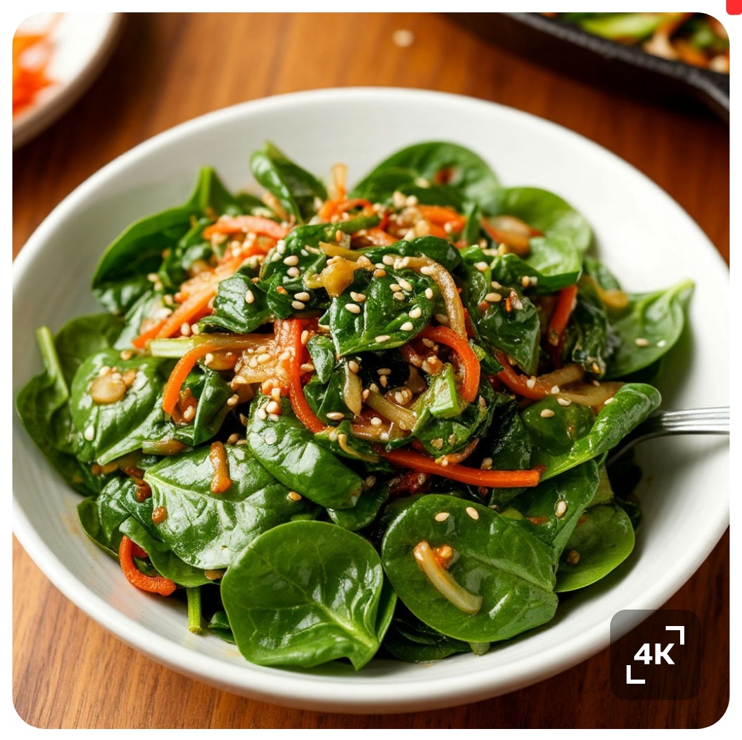 Салат из шпината и моркови по-корейски — это вкусное и полезное блюдо, которое легко приготовить в домашних условиях. Этот салат сочетает в себе свежесть шпината и аромат острой моркови, приготовленной в корейском стиле. Ниже представлен подробный рецепт и пошаговая инструкция для приготовления этого салата. ### Ингредиенты: - Шпинат свежий — 300 г - Морковь — 2 средние шт. (около 200 г) - Чеснок — 2 зубчика - Растительное масло (лучше кунжутное или подсолнечное) — 2 столовые ложки - Соевый соус — 1 столовая ложка - Уксус рисовый или яблочный — 1 чайная ложка - Сахар — 1 чайная ложка - Красный молотый перец (по вкусу) - Кунжут (семена) — 1 столовая ложка - Соль — по вкусу - Зелень для украшения (по желанию) ### Приготовление: #### Шаг 1: Подготовка шпината Свежий шпинат тщательно промойте под холодной водой, удалите грубые стебли. После промывки залейте шпинат кипящей водой на 1-2 минуты, чтобы он слегка притух и стал мягче. Затем сразу же переложите шпинат в