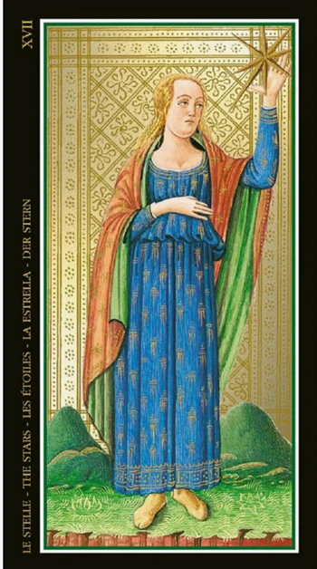 Аркан ТАРО Звезда появляется после сурового удара Башни (XVI Аркан) и перед тревожными туманами Луны (XVIII Аркан). И в этом промежутке она дарит то, без чего невозможно жить: надежду, исцеление и веру в будущее. Символизм: На классической карте Райдера-Уэйта мы видим обнаженную женщину. Она беззащитна, но не стыдится этого. Её нагота — это символ искренности, принятия себя и открытости миру после крушения всех масок и иллюзий Башни. Она держит два кувшина. Одним она наполняет водоём (подсознание, эмоции), другим — поливает землю (сознание, реальный мир). Это говорит о восстановлении потока энергии: внутренние ресурсы (вода) теперь свободно питают внешнюю жизнь, а связь с высшим «Я» (звёзды) становится постоянной. На небе сияет одна большая звезда — её внутренний свет, душа, и семь маленьких, отсылающих к семи древним планетам/чакрам, символизируя гармонию и целостность. Значение: 1. Восстановление сил. После тяжёлого периода вы начинаете приходить в себя. Появляется энергия, чтобы з