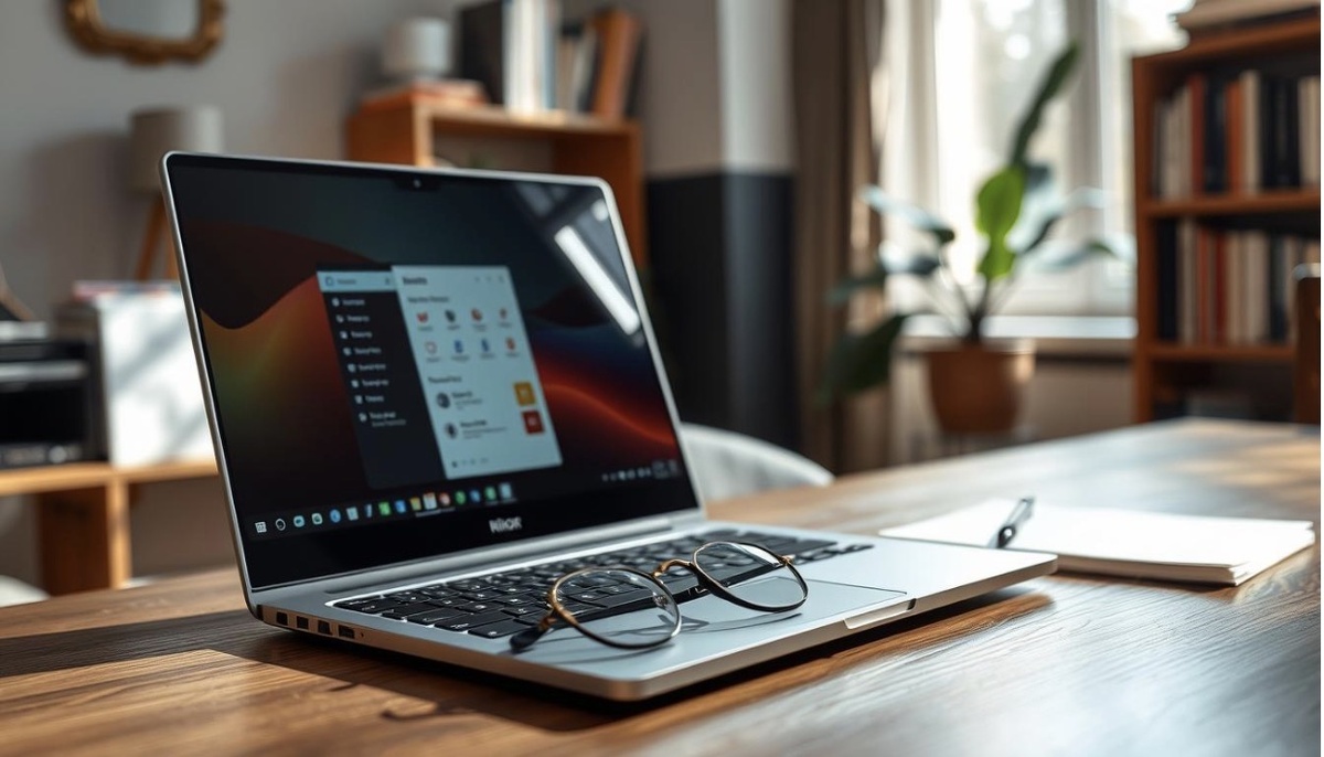 A sleek 15-inch Rikor ARZ 103.2 laptop sits elegantly on a modern wooden desk, showcasing its thin profile and premium metallic finish. The laptop is open, revealing a vibrant display with high-resolution visuals, set against a softly blurred office environment. Natural light streams through a nearby window, casting gentle highlights on the reflective surfaces, enhancing the sophistication of the design. The foreground captures the laptop's keyboard with subtle backlighting, while the middle shows the laptop's sleek hinge and outline. The background features minimalist decor, such as a potted plant and a stylish lamp, creating a productive and inviting atmosphere. The overall mood conveys professionalism and innovation, perfect for a workspace dedicated to study and work.
