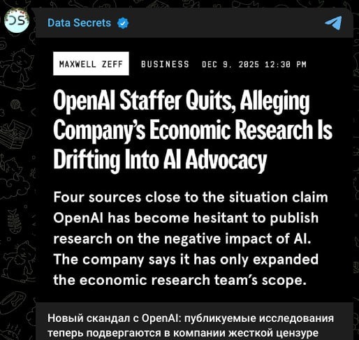 Не все так однозначно 🥺 Паблик Data Secrets выложил пост о том, что OpenAI цензурирует исследования связанные с влияем ИИ на экономику. Ну, а что вы хотели? Исследования — это тоже один из маркетинговых инструментов 👏 Если бизнес заинтересован в прибыли, росте стоимости своих акций и новых раундах инвестиций, логично предположить, что исследования будут правильные 😏 Дополним картину: На днях у Ромы Тарасенко вышел подкаст с футурологом Русланом Юсуфовым (смотреть под впн здесь), где Руслан тоже затронул эту тему. В мире есть компании, которые формируют образ будущего и ведут к нему. И часть инфополя явно занята вектором этого будущего. 🔥 Но может ли быть другое будущее? 🔥 Можем ли мы на него повлиять? 🔥 Этично ли использовать исследования в маркетинговых целях? Ответьте себе сами :) Спасибо, что читаете, комментируете и делитесь @onedaynote 🎸