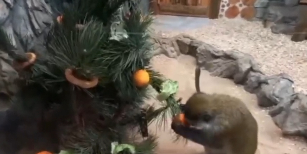 В Воронежском зоопарке обезьян угостили съедобной новогодней елкой