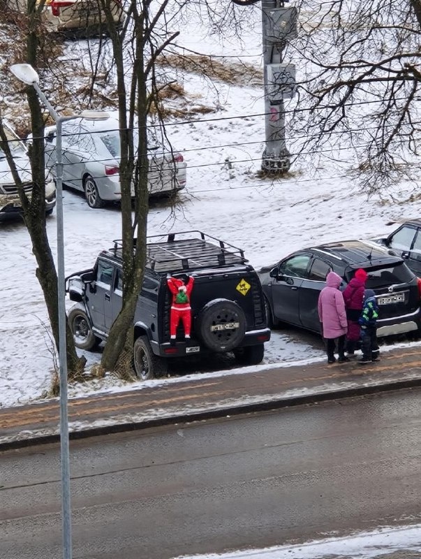 Ещё одно украшенное к Новому Году авто заметили в Железнодорожном⭐️ Внедорожник с повисшим на крышке багажника Дедом Морозом сфотографировали жители ЖК «Столичный».