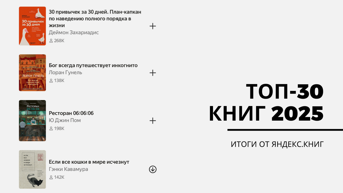 Многие сервисы уже подводят итоги, как пользовательские, так и общие. Яндекс.Книги уже сообщили мне о количестве прочитанного, а также поделились, какие книги были особо популярны у читателей в 2025 году. Я, конечно же, заглянула и полюбопытствовала. Кое-что из этого я вижу впервые, но в целом ничего удивительного для себя не увидела. Сделка с дьяволом Естественно, в топе есть роман «Если все кошки в мире исчезнут» Гэнки Кавамура. У меня, к слову, даже отзыв есть на эту книгу, так как я не удержалась и сама прочитала произведение. Книга сейчас очень популярная, и в первой половине года автор находился на третьем месте по количеству издаваемых в России экземпляров своих произведений. На Яндекс.Книгах историю про сделку с дьяволом прочитало 142 тысячи человек, а еще 63 тысячи прослушали аудиокнигу. В топ затесалась и Мария Корелли со «Скорбью Сатаны». Книгу очень любят подростки и с удовольствием её читают. Прочитали её 115 тысяч человек, а прослушали 57 тысяч. Уютные детективы Конечно