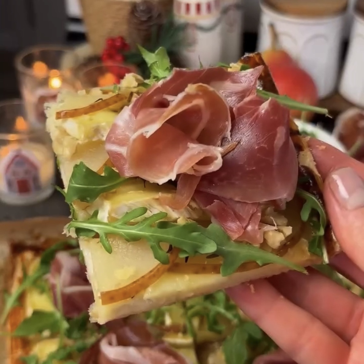 🔗Видео-рецепт в конце статьи🎥 Есть рецепты, которые выручают всегда: когда гости на пороге, когда хочется чего-то красивого без лишних усилий или когда нужен быстрый вариант к вину. Слоёное тесто с бри и грушей — именно такой рецепт. Хрустящее тесто, нежный сыр, сладкая груша, аромат тимьяна и капля мёда… А после выпечки — свежая руккола, орехи и хамон. Минимум действий, максимум вкуса 😋 🥐Ингредиенты • Слоёное тесто • Сыр бри • Груша • Тимьян (свежий или сушёный) • Мёд Для подачи: • Руккола • Грецкие орехи • Хамон (по желанию) 🥐Как приготовить Лист слоёного теста слегка надрежьте по краям, формируя рамку, и проколите вилкой середину. Выложите ломтики бри и тонко нарезанную грушу. Посыпьте тимьяном и слегка полейте мёдом. Выпекайте при температуре, указанной на упаковке теста, до румяной корочки. Достаньте из духовки и дайте постоять 10 минут. Перед подачей добавьте рукколу, орехи и хамон. 🥐Варианты начинок — сохраняйте идеи Если груша и бри уже надоели или хочется разнообра