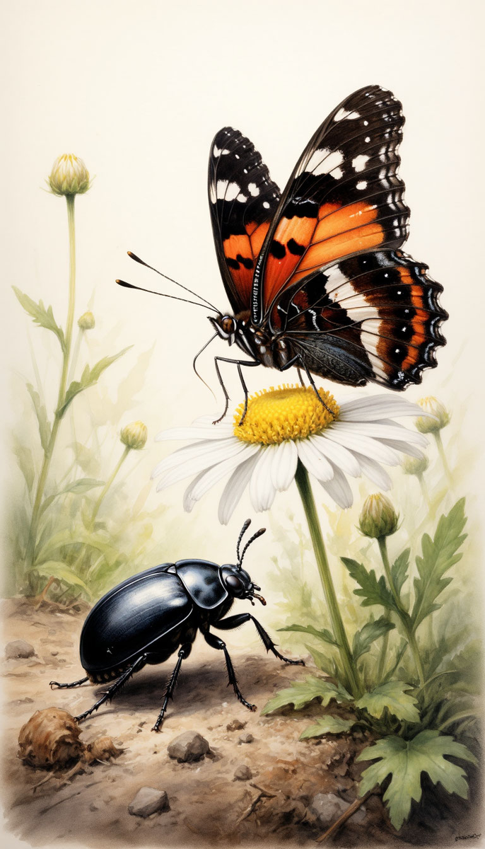 Но однажды его маленький, упорядоченный мирок перевернулся. Над полянкой, где он трудился, пролетело нечто совершенно волшебное. Это была бабочка-адмирал. Её крылья были полотном, на котором смешались алый закат мака, темная синева грозового неба и невинность белой ромашки. Она парила - не ползала, не копошилась, а именно парила, касаясь цветов лишь кончиками невесомых лапок. Её полёт был немыслимой, божественной грацией.