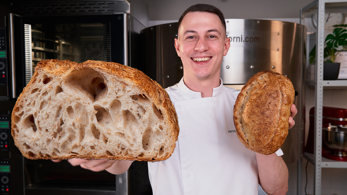 В чем секрет вкусного и полезного хлеба? В цельнозерновой муке, пророщенном зерне и закваске! Именно они сделали его максимально полезным, наполнили потрясающими ароматами и вкусами, а еще дали ему ту самую особую текстуру. Ингредиенты: Приготовление: 1. Подготовка зерна: Замочить зерно в воде на 8-12 часов. Далее слить воду и оставить под крышкой на 48 часов в теплом месте до появления ростков 3-4 мм. 2. Замес теста: В дежу тестомеса внести муку высшего сорта и цельнозерновую, закваску, мальтозную патоку и "основную" воду. Замешивать на медленной скорости до начального развития клейковины (примерно 5-7 минут). Перед включением быстрой скорости внести соль. Включить быструю скорость и приступить к внесению воды "на долив" - вносить её следует небольшими порциями! Продолжить замес на быстрой скорости примерно 4-5 минут – до умеренного развития клейковины. 3. Добавление зерна: Далее внести пророщенное зерно (предварительно измельченное при помощи мясорубки или блендера). Замешивать на