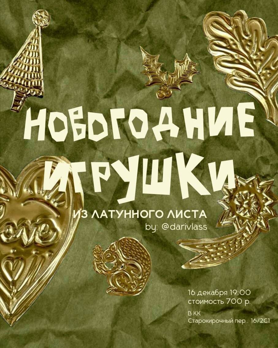 Будете мастерить украшения из латунного листа! Создадите несколько новогодних игрушек на елку или мини гирлянду, которыми сможем украсить пространство к праздникам 🎄 🕐16 декабря, 19.00 📍м.Бауманская, Старокирочный, 16/2с1 💵700₽ + покупка напитка на баре Запись через @darivlass Отправь другу и спроси: пойдем со мной? 😎 #мастеркласс #новыйгодцц