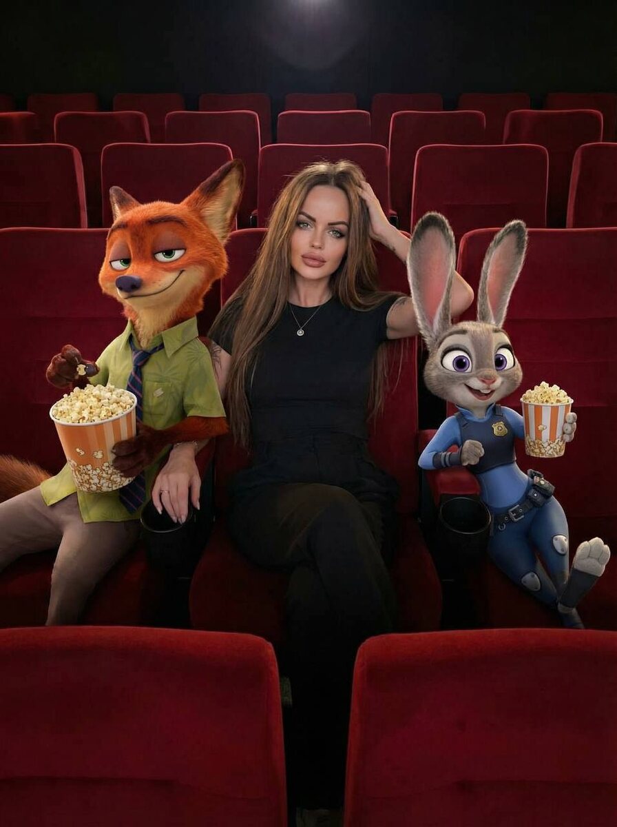 ? 🐰 #юмор@promtgs Делитесь идеями в комментах 💬 ⚙️ Использовали: Banana 🍌 ⚙️ Промт: Персонаж с референсного изображения, без изменения лица, находится в зрительном зале кинотеатра с красными сиденьями в центре кадра, а по обе стороны от него находятся два знаменитых персонажа Ник Уайлд (в зелёной рубашке и галстуке, с ухмылкой) и Джуди Хоппс (в полицейской форме) из мультфильма «Зверополис». Ник улыбается, сидя рядом, а Джуди с выражением дружелюбия также рядом. в руках держат ведра с попкорном, в динамичной и весёлой позе, как будто фото получилось случайно. На заднем плане видно красные кресла кинотеатра, создающие атмосферу, будто все сидят в кинозале. Атмосфера изображения спокойная и несколько уютная, с элементами ожидания и сосредоточенности. Свет на фотографии мягкий и приглушенный, с акцентом на персонажей, что создаёт тёплую, почти интимную атмосферу. Фон затемнён, с красными креслами кинотеатра, что способствует ощущению уюта и сосредоточенности. 💬 Доступно в боте: