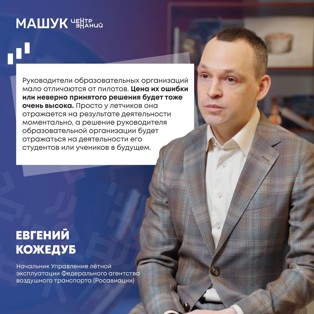 В чём сходства управленца и пилота воздушного судна? 🤔 Мы спросили у Евгения Кожедуба, начальника Управления лётной эксплуатации Росавиации, во время второго модуля программы развития управленческого кадрового резерва системы образования РФ. 🎦 В новом интервью вы найдёте множество интересных советов для руководителей образовательных организаций о том,👉как сохранять ясность мышления в стрессовых ситуациях, что представляет собой «градиент авторитетов» в авиации и как применять этот принцип в управлении командой.