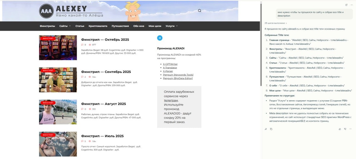👨💻 Браузер Comet от Perplexity Тестировал браузер Comet с автоматизацией под разные задачи: собрать ссылки на сайте, собрать title и description, сделать форму в Яндекс Формах и написание отзывов. 1⃣ Собрать ссылки - вообще легко и не проблема для браузера. 2⃣ Сбор title и description - уже посложнее. Не хочет с ходу собирать данные со всех страниц, собрал только с основных. Я не стал дальше это ковырять. 3⃣ Попробовал создать форму в Яндекс Формах. Попросил сделать общие вопросы для соискателя на вакансию. Сделал с косяками, но там всё быстро правится и можно в отдавать в прод :) 4⃣ Тестил проставление отзывов. Браузер ленив и отказывался всё делать автоматически, каждый раз требовал что-то ему разрешить и спрашивал как лучше сделать. Хотя и промпт был самый простой. Может с хорошим промптом будет посговорчивее. Всё это делается медленно, гораздо быстрее написать скрипт и сделать всё через него. 🤷♀️ Не знаю чего там c ограничениями по функционалу для тех, у кого нет подписки