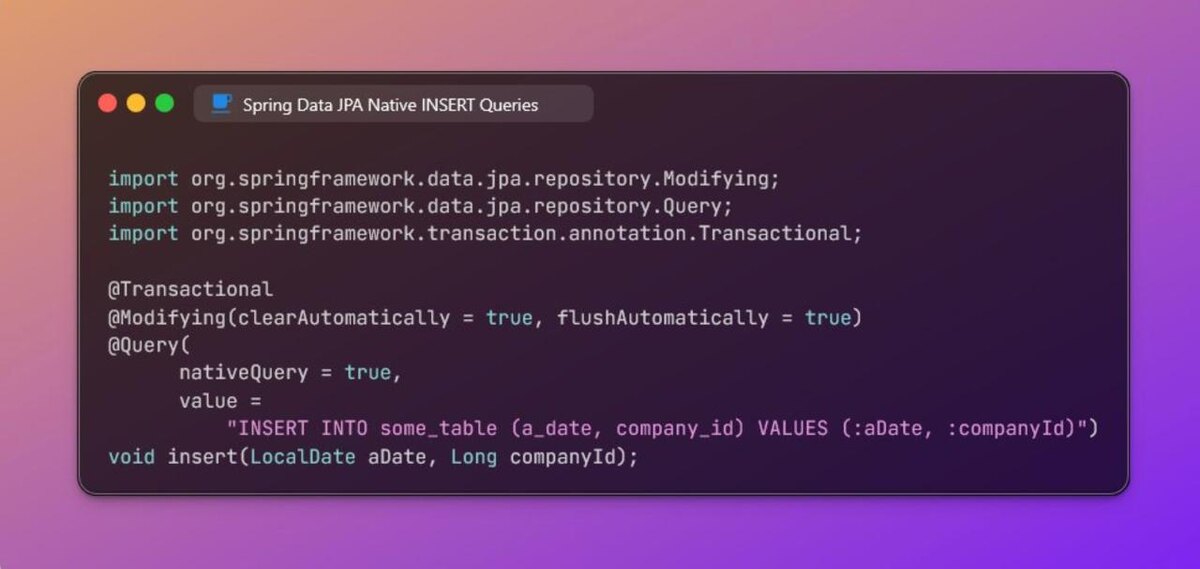 Совет по Java/JPA: в JPA можно использовать native queries не только для SELECT, но и для INSERT, UPDATE и DELETE. Важно: такие операции идут в обход EntityManager/PersistenceContext, поэтому изменения не попадают в контекст и не синхронизируются с сущностями автоматически. На примере Spring Data JPA: - @Modifying позволяет выполнять модифицирующие запросы - nativeQuery = true — включает нативный SQL - clearAutomatically / flushAutomatically управляют очисткой и синхронизацией контекста транзакции Нативные INSERT/UPDATE/DELETE удобны, когда нужна высокая производительность, сложный SQL или массовая вставка данных. @javarush