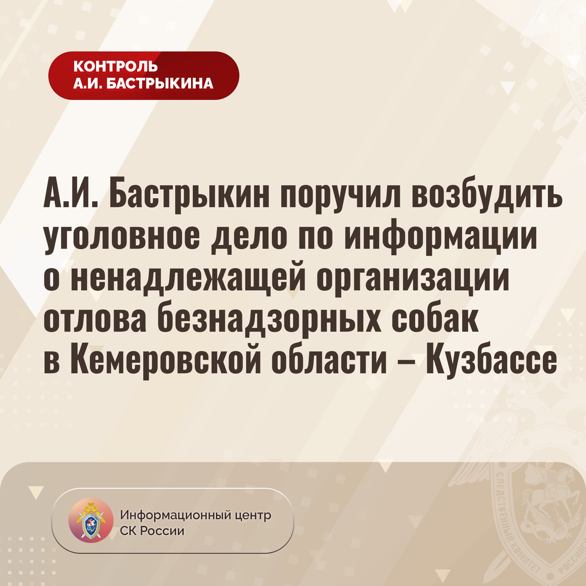 А.И. Бастрыкин поручил возбудить уголовное дело по информации о ненадлежащей организации отлова безнадзорных собак в Кемеровской области – Кузбассе В СМИ и социальной сети сообщается, что на протяжении длительного времени в поселке Чугунаш Кемеровской области – Кузбасса обитает большое количество безнадзорных собак, которые систематически проявляют агрессию в отношении граждан, в том числе детей. Местные жители опасаются за свою жизнь и здоровье, а также за безопасность несовершеннолетних. Несмотря на имеющиеся нарушения, до настоящего времени мер к разрешению ситуации не принимается. В СУ СК России по Кемеровской области – Кузбассу организована процессуальная проверка. Председатель Следственного комитета Российской Федерации Александр Иванович Бастрыкин поручил и.о. руководителя СУ СК России по Кемеровской области – Кузбассу Павлу Васильевичу Курочкину возбудить уголовное дело и представить доклад о предварительных и окончательных результатах его расследования. Исполнение поручения