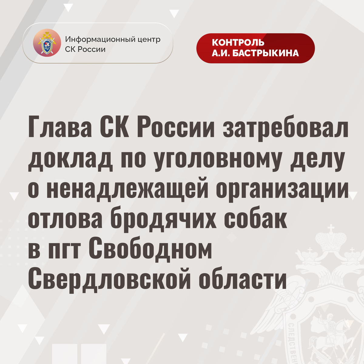 Глава СК России затребовал доклад по уголовному делу о ненадлежащей организации отлова бродячих собак в пгт Свободном Свердловской области В социальной сети сообщается, что на протяжении длительного времени в поселке городского типа Свободном Свердловской области обитает большое количество безнадзорных собак, которые систематически нападают на граждан. Так, агрессивные животные набросились на женщину, укусив ее. Несмотря на имеющиеся нарушения, мер к их устранению не принимается. В СУ СК России по Свердловской области возбуждено уголовное дело. Председатель Следственного комитета Российской Федерации Александр Иванович Бастрыкин затребовал у руководителя СУ СК России по Свердловской области Богдана Валерьевича Францишко доклад о ходе и результатах расследования уголовного дела. Исполнение поручения поставлено на контроль в центральном аппарате ведомства. #СледственныйКомитет #СКРоссии #СК #ИЦСКР #ИнформационныйЦентр #АлександрБастрыкин #ПредседательСКР #КонтрольПредседателяСКР #Комме