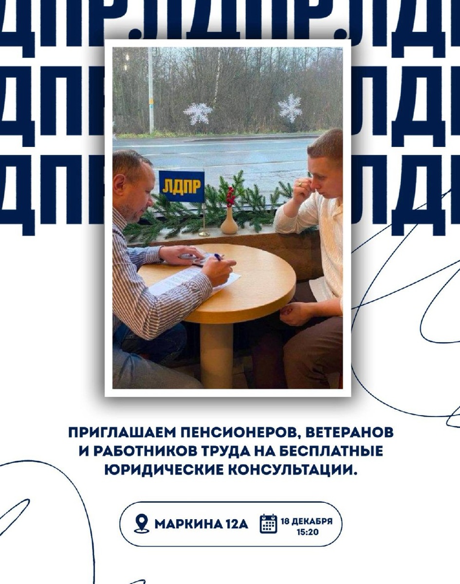Бесплатные юридические консультации для пенсионеров, ветеранов и работников труда от ЛДПР Санкт-Петербургское региональное отделение ЛДПР приглашает на бесплатные юридические консультации для пенсионеров, ветеранов и людей труда в рамках проекта «Трудовая доблесть России». 🗓 18 декабря ⏰ 15:20 📍 ул. Маркина 12А Проект «Трудовая доблесть России» реализуется ЛДПР совместно с благотворительным фондом «Победа» в рамках одноимённого партийного направления. Фонд оказывает всестороннюю поддержку участникам СВО и их семьям, гражданам, пострадавшим от военных действий, содействует волонтёрским инициативам и проводит выездные консультации, в том числе на новых территориях. Сегодня отделения фонда работают в 15 городах России и ближнего зарубежья. Консультации проходят в приёмной регионального отделения ЛДПР - такой формат позволяет получить качественную и доступную юридическую помощь в удобных условиях. 📌Регистрация 🔗 Мы ВКонтакте 🖥 Сайт ЛДПР | Санкт-Петербург