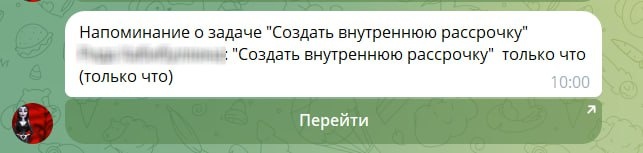 Люблю напоминалки, которые можно сделать прям из карточки пользователя. Чуть не забыла про то, что сегодня нужно девушке отправить ссылку на первый взнос по внутренней рассрочке, а тут, хоп, и бот в телегу прислал напоминашку))