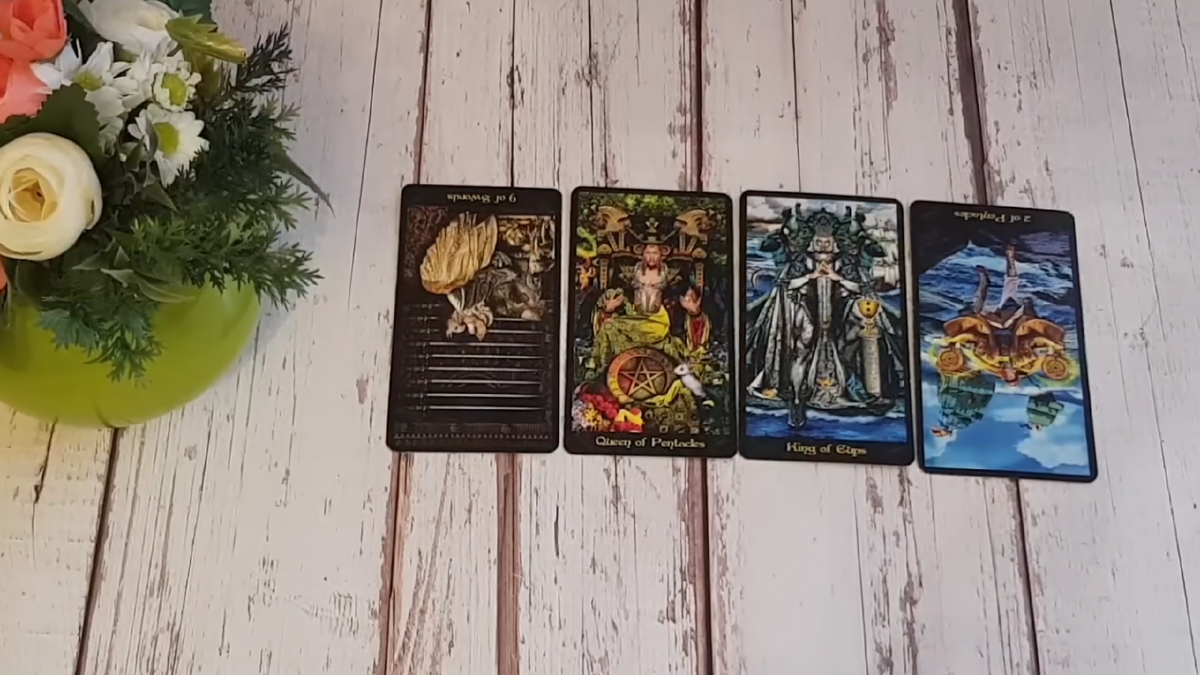 Всем привет, с вами Анна, девочки, и у меня сегодня для вас расклад, который я назвала «Помирает ухи — просит, что не ладится у мужика», потому что, честно говоря, смотреть на эту историю — всё равно что наблюдать, как котёнка затаскивают в болото и он даже не пытается вырваться, просто лежит и ждёт, когда его совсем затащит. Давайте посмотрим, кто к нам пришёл, и сразу выпадает Девятка Мечей перевёрнутая, Королева Пентаклей, Королева Кубков и Двойка Пентаклей перевёрнутая — и сразу ясно: перед нами мужчина, который прячется за спиной женщины, будто за щитом, будто она — его защита, его опора, его оправдание, хотя на самом деле он просто боится женщин, боится их силы, их решимости, их способности сказать «нет», и, возможно, корень этого страха — в прошлом, в строгой матери, которая научила его лавировать, приспосабливаться, врать, лишь бы избежать наказания, лишь бы не получить по шее.