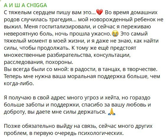 Трагедия в семье популярной тиктокерши Аиши Чигга: во время домашних родов, которые проходили в надувном бассейне и без помощи акушеров, у неё погиб ребёнок💔 По информации СМИ: после того как ребёнок Чигги появился на свет, он около получаса находился в воде и ещё через полчаса перестал дышать. Врачи не смогли его спасти. Блогешу реанимировали. Правоохранительные органы начали проверку по этому делу. На фоне разгорающегося скандала родители тиктокерши сделали короткое заявление: "Всё, что пишут по поводу бассейна, что ребёнок лежал час в воде — всё неправда. Говорить ничего не хочется. Верная информация — ребёнок скончался". Фото: aishachigga/TikTok Spletnik