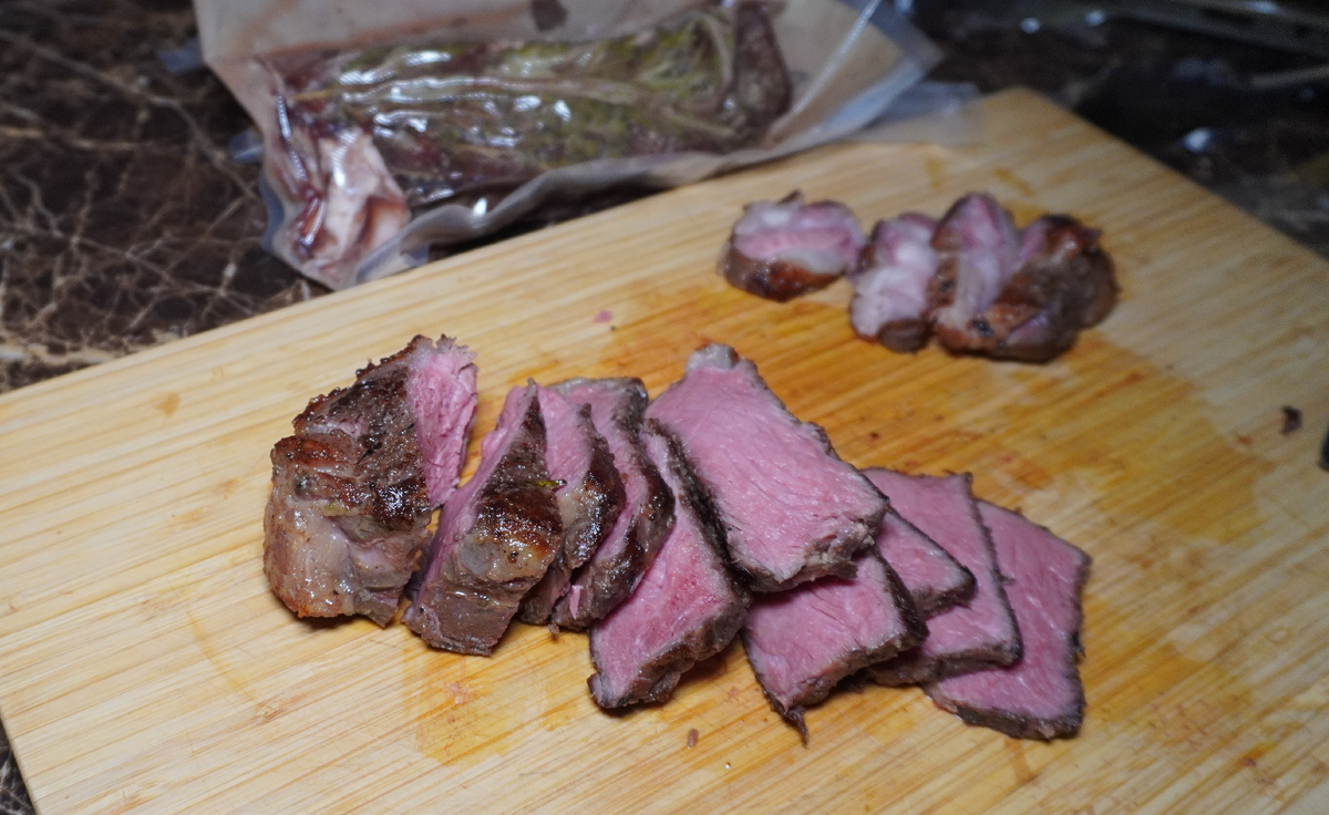 Использую су-вид первый раз! готовлю стриплойн! простой и вкусный #рецепт Ингредиенты: Стейк стриплойн(у меня обычная говядина, толщина 5-6 см) Специи: соль, черный перец, сушеный чеснок, веточки розмарин, веточки тимьяна Приготовление: 1. Для начала отделяем и зачищаем наш стейк, сушим бумажным полотенцем и со всех сторон солим перчим и добавляем сушеный чеснок; 2. Отправляем каждый стейк в отдельный вакуумный пакет, сверху и снизу обкладываем стейк веточками розмарина и тимьяна, вакуумируем стейк со специями; 3. В емкость наливаем воду для сувида, выставляем температуру 57 градусов и время 4 часа, как только наберется температура 57 градусов мы кладем мясо в воду и ждём 4 часа; 4. Я жарил на следующий день так как ночью не хотел есть, обжаривал по 1-1:30 минуте с двух сторон и с боков по 15-30 секунд, стейк предварительно очистил от веточек тимьяна и розмарина, обсушил бумажным полотенцем, надрезал боковой жир и отправил обжариваться, после дал ему 2-3 минуты отдохнуть и нарезал его.
