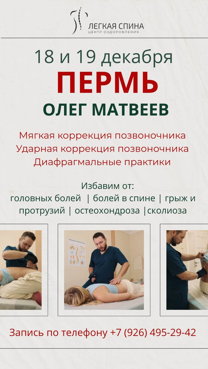 ГДЕ УСПЕТЬ? До Нового года осталось 16 дней, специалисты центра Легкая Спина отправляются в последние командировки, успевайте и вы записаться на прием: 📍ПЕРМЬ - 18-19 декабря, специалист Олег Матвеев 📍САРАТОВ - 21 декабря, специалист Олег Матвеев 📍МОСКВА - 18-21 декабря, специалист Дмитрий Маслов Мягко и безболезненно вступайте в Новый 2026 год 🎄 Запись по телефону: ☎️ + 7 (499) 755-53-55 - Москва ☎️ + 7 (926) 495-29-42 - Регионы