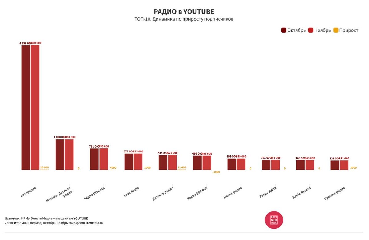 ➡️ Канал Детского радио (522К), который вошел в сентябре в категорию > 500К, лидирует в ноябре по приросту подписчиков 📈+11К