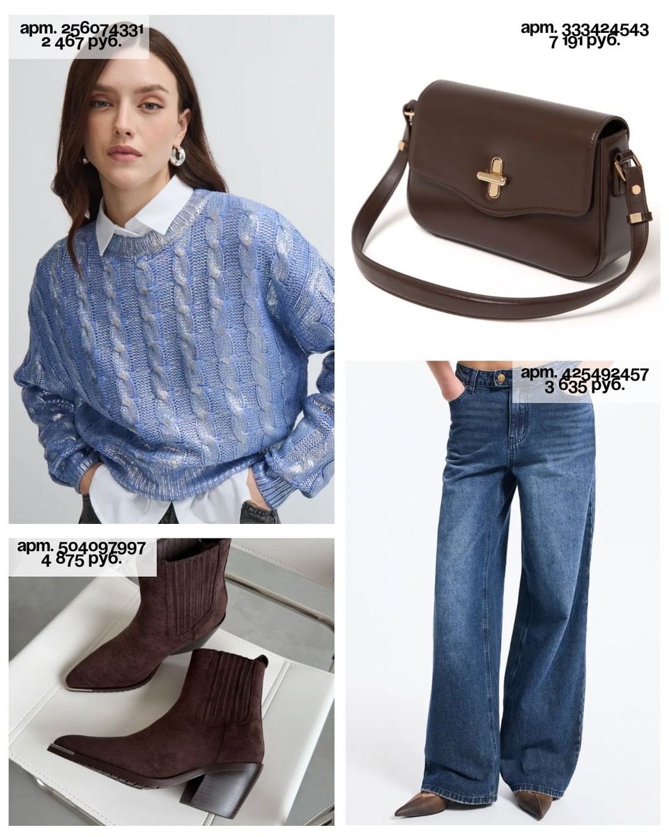 Есть вещи, которые не кричат о трендах, но сразу создают ощущение вкуса, собранности и уверенности. Именно такие позиции я собрала в этой подборке. Здесь нет случайных деталей — каждая находка продумана с точки зрения сочетаний, сезонности и практичности. Это база с характером, которую легко адаптировать под повседневную жизнь, работу, встречи и особые выходы. Ниже — подробный разбор каждой позиции строго по порядку, с рекомендациями стилиста: как носить, с чем сочетать и в каких ситуациях вещь раскроется на сто процентов. 1. Арт. 256074331 — вязаный джемпер с узором косы Мягкий, уютный джемпер в спокойном голубом оттенке — идеальный пример интеллигентного повседневного трикотажа. Фактурные косы добавляют глубину образу, а прямой крой делает вещь универсальной. С чем носить: — с классическими синими или молочными джинсами; — с прямыми брюками графитового или шоколадного цвета; — поверх белой рубашки для многослойного образа. Когда уместен: Осень, зима, прохладная весна. Подходит для