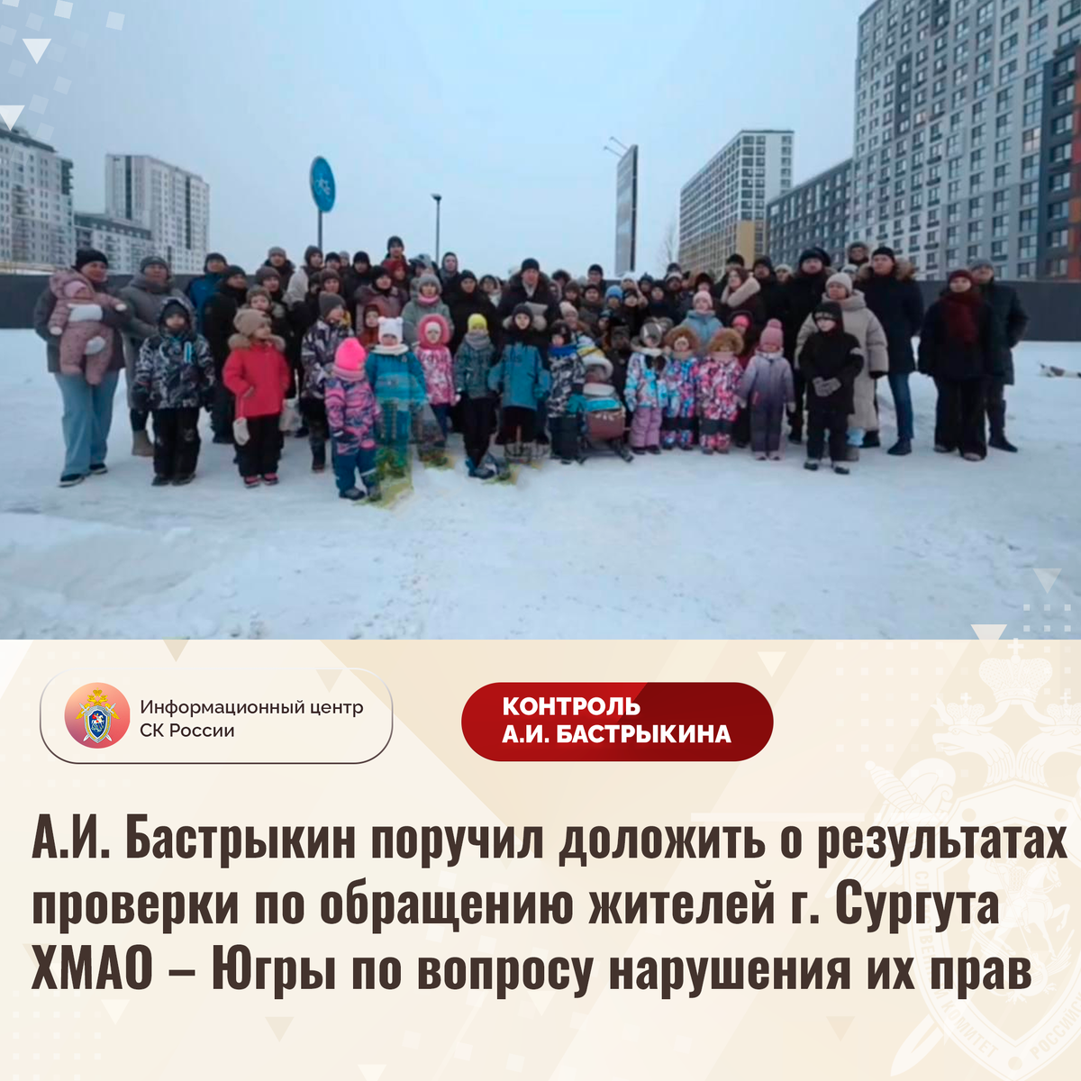 А.И. Бастрыкин поручил доложить о результатах проверки по обращению жителей г. Сургута Ханты-Мансийского автономного округа – Югры по вопросу нарушения их прав В сети Интернет размещено видеообращение жителей нескольких микрорайонов города Сургута Ханты-Мансийского автономного округа - Югры по вопросу нарушения их прав. Более восьми лет назад граждане приобрели квартиры в ЖК «Новин», где отсутствуют детские сады и школы. До настоящего времени возведение социальных объектов не организовано, сроки проектирования и строительства постоянно переносятся. Кроме того, движение школьного автобуса не осуществляется, в связи с чем несовершеннолетние вынуждены самостоятельно добираться до образовательных учреждений в других районах города. В СУ СК России по Ханты-Мансийскому автономному округу – Югре организована процессуальная проверка. Председатель Следственного комитета Российской Федерации Александр Иванович Бастрыкин поручил руководителю СУ СК России по Ханты-Мансийскому автономному округу