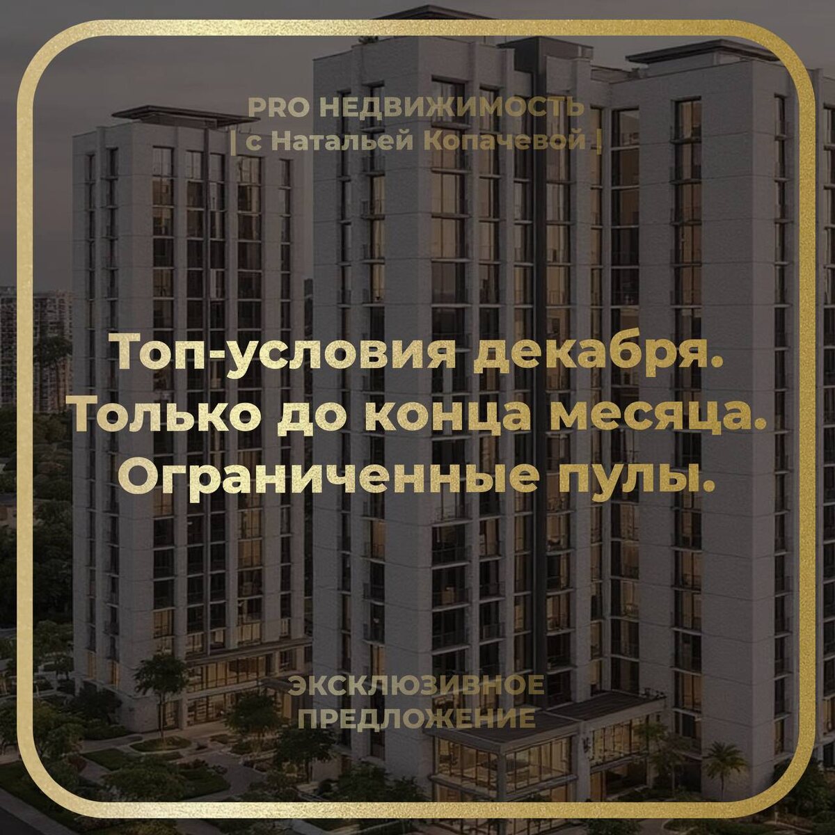 Декабрь — месяц, когда недвижимость покупают не «потом», а выгодно. Застройщики закрывают год, банки подыгрывают, скидки — реальные, а не «до». ➡️ Если вы ждали момент — он сейчас. Топ-условия декабря. Только до конца месяца. Ограниченные пулы. 🟡 Скидки до 40% на отдельные лоты (да, именно столько — и только на сутки); 🟡 Ипотека без первоначального взноса и ставки от 5%; 🟡 Беспроцентные рассрочки с платежами от 40–200 тыс. ₽ в месяц; 🟡 Фиксация цены до 2028 года без удорожания; 🟡 Выгода в миллионах рублей на конкретных квартирах; 🟡 Лизинг и редкие форматы сделок, которые обычно недоступны! 📍 Локации, которые продают себя сами: престижные районы, метро в пешей доступности, парки, вузы, высокая аренда, центр ближе, чем кажется. ➡️ Форматы на любой сценарий: 🟡 для жизни; 🟡 для аренды; 🟡 для сохранения капитала; 🟡 для входа с минимальным бюджетом! 🅰️ Важно: 🟡 скидки действуют на ограниченный пул 🟡 условия меняются ежедневно 🟡 часть предложений — только до 20–31 декабря