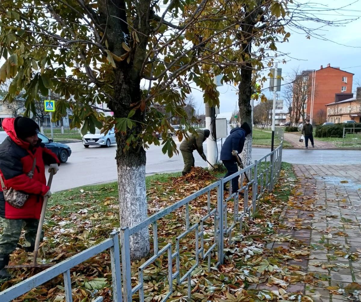 Сотрудники учреждения занимаются уборкой опавшей листвы.