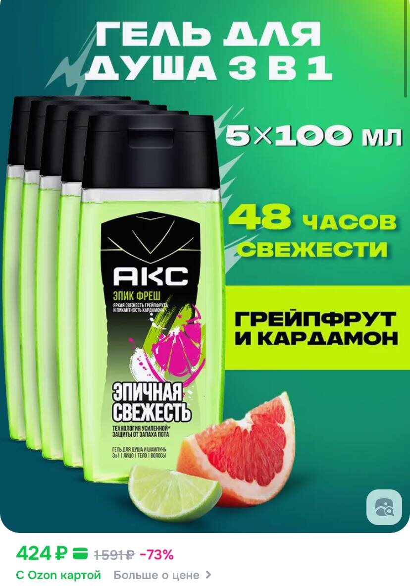 Акс Гель для душа для умывания лица шампунь мужской 3в1 Эпик Фреш 100 мл 5 шт https://ozon.ru/t/HUBVbjm ✅ Канал по скидкам 🔣 Бот с промокодами