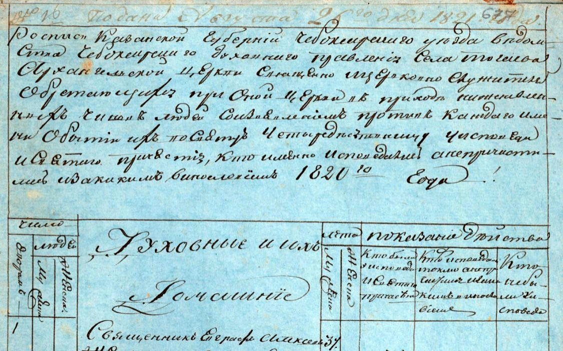 ГИА Чувашской Республики (ГИА ЧР), фонд № 225, опись № 7, дело № 42, стр. 1309 скан. Подана августа 26-го дня 1821 года. Роспись Казанской Губернии Чебоксарского уезда ведомства Чебоксарского духовного правления села Тогаева Архангельской церкви священно церковно служителям с причтом обретающихся при оной церкви в приходе нижеявленных чинов людей со изъявлением против каждого имени о бытии их в Святую Четыредесятницу у исповеди и Святого причастия, кто именно исповедались а не причастились, и за каким винословием 1820 года. Духовные и их домашние. № 4. Дьячек Андрей Михайлов. 37. Жена Наталья Борисова. 38. У них дети: Михаил. 12. Иван. 6. Федосия. 8. https://yandex.ru/archive/catalog/7167d29a-6f45-42e6-9928-06f1a2a810ff/1309