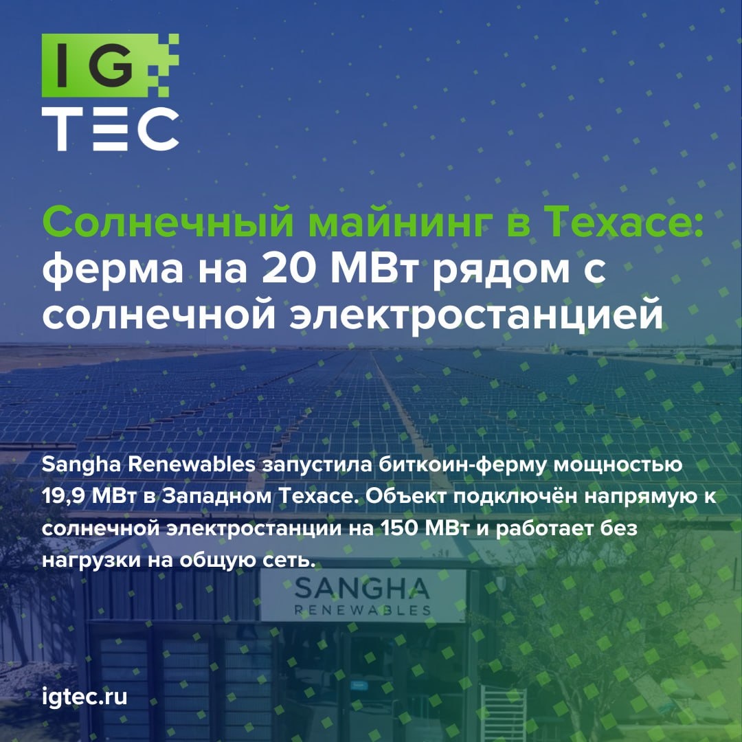 ☀️⛏️Солнечный майнинг в Техасе: ферма на 20 МВт рядом с солнечной электростанцией Sangha Renewables запустила биткоин-ферму мощностью 19,9 МВт в Западном Техасе. Объект подключён напрямую к солнечной электростанции на 150 МВт и работает без нагрузки на общую сеть. Основные параметры проекта: 🔹мощность майнинга: 19,9 МВт 🔹источник энергии: собственная СЭС 150 МВт 🔹формат: собственный ЦОД с управляемой нагрузкой и своим оборудованием Sangha сама владеет и управляет объектом: от инфраструктуры и майнеров до систем контроля потребления. TotalEnergies закрывает «ночные» часы и помогает сглаживать ценовую волатильность. 📊Ставка сделана на гибкость. Майнинг здесь - инструмент монетизации солнечной генерации, особенно там, где есть перегрузки сети или нестабильные цены. Быстрое увеличение и снижение потребления делает такие ЦОДы удобным партнёром для ВИЭ. 📈Sangha планирует масштабировать эту модель и запускать аналогичные объекты в других регионах. Эффективный майнинг сегодня - это