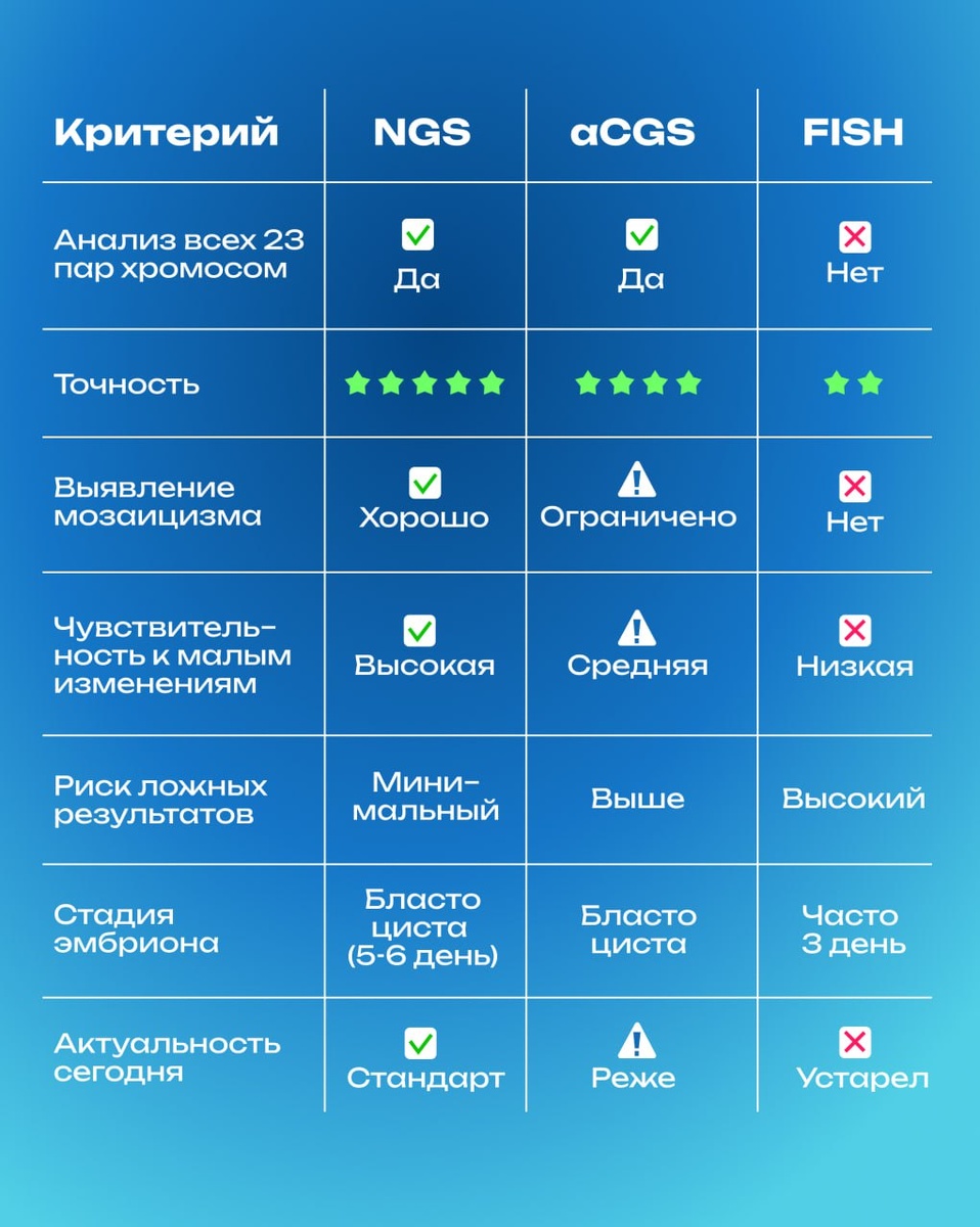 π ΠΠ°Π³Π»ΡΠ΄Π½ΠΎΠ΅ ΡΡΠ°Π²Π½Π΅Π½ΠΈΠ΅ ΠΠΠ’ ΠΌΠ΅ΡΠΎΠ΄ΠΎΠΌ NGS Ρ Π΄ΡΡΠ³ΠΈΠΌΠΈ ΠΌΠ΅ΡΠΎΠ΄Π°ΠΌΠΈ, ΠΊΠΎΡΠΎΡΡΠ΅ ΠΏΡΠΈΠΌΠ΅Π½ΡΠ»ΠΈΡΡ ΠΈΠ»ΠΈ ΠΏΡΠΈΠΌΠ΅Π½ΡΡΡΡΡ Π² ΠΠΠ. ΠΡΠ½ΠΎΠ²Π½ΡΠ΅ ΠΌΠ΅ΡΠΎΠ΄Ρ ΠΠΠ’ 1οΈβ£ NGS (Next Generation Sequencing) β ΡΠΎΠ²ΡΠ΅ΠΌΠ΅Π½Π½ΡΠΉ ΡΡΠ°Π½Π΄Π°ΡΡ. Π‘Π°ΠΌΡΠΉ ΡΠΎΡΠ½ΡΠΉ ΠΈ ΠΈΠ½ΡΠΎΡΠΌΠ°ΡΠΈΠ²Π½ΡΠΉ ΠΌΠ΅ΡΠΎΠ΄ ΠΠΠ’ Π½Π° ΡΠ΅Π³ΠΎΠ΄Π½Ρ 2οΈβ£ aCGH (array CGH) β ΠΏΡΠ΅Π΄ΡΠ΄ΡΡΠΈΠΉ Β«Π·ΠΎΠ»ΠΎΡΠΎΠΉ ΡΡΠ°Π½Π΄Π°ΡΡΒ». ΠΡΠΎΠΌΠ΅ΠΆΡΡΠΎΡΠ½ΡΠΉ ΡΡΠ°ΠΏ, ΡΡΡΡΠΏΠ°ΡΡΠΈΠΉ NGS 3οΈβ£ FISH β ΡΡΡΠ°ΡΠ΅Π²ΡΠΈΠΉ ΠΌΠ΅ΡΠΎΠ΄ (ΠΏΡΠ°ΠΊΡΠΈΡΠ΅ΡΠΊΠΈ Π½Π΅ ΠΈΡΠΏΠΎΠ»ΡΠ·ΡΠ΅ΡΡΡ). ΠΡΡΠΎΡΠΈΡΠ΅ΡΠΊΠΈΠΉ ΠΌΠ΅ΡΠΎΠ΄, ΠΊΠΎΡΠΎΡΡΠΉ Π½Π΅ ΡΠΎΠΎΡΠ²Π΅ΡΡΡΠ²ΡΠ΅Ρ ΡΠΎΠ²ΡΠ΅ΠΌΠ΅Π½Π½ΡΠΌ ΡΡΠ΅Π±ΠΎΠ²Π°Π½ΠΈΡΠΌ ΠΠ°ΠΆΠ½ΡΠΉ ΠΌΠΎΠΌΠ΅Π½Ρ ΠΠΠ’ Π½Π΅ Π΄Π΅Π»Π°Π΅Ρ ΡΠΌΠ±ΡΠΈΠΎΠ½ Β«ΠΈΠ΄Π΅Π°Π»ΡΠ½ΡΠΌΒ», Π° Π»ΠΈΡΡ ΠΏΠΎΠΌΠΎΠ³Π°Π΅Ρ Π²ΡΠ±ΡΠ°ΡΡ Π½Π°ΠΈΠ±ΠΎΠ»Π΅Π΅ Π³Π΅Π½Π΅ΡΠΈΡΠ΅ΡΠΊΠΈ Π±Π»Π°Π³ΠΎΠΏΡΠΈΡΡΠ½ΡΠΉ ΠΈΠ· ΡΠΆΠ΅ ΠΏΠΎΠ»ΡΡΠ΅Π½Π½ΡΡ