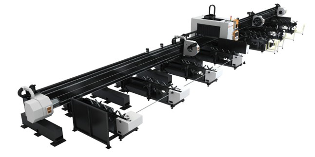 Типовой промышленный оптоволоконный лазерный труборез: массивная станина поддерживает длинную трубу, слева виден передний патрон с приводом для зажима и вращения трубы, по центру — подвижная режущая головка. Такое устройство обеспечивает высокую точность и стабильность при работе с трубами большой длины. Конструкция лазерного станка для резки труб существенно отличается от станка для резки листа, главным образом из-за необходимости надежно фиксировать и вращать длинномерную заготовку. Тем не менее в целом набор узлов схож — любой лазерный труборез включает механическую часть, лазерный источник, оптическую систему и систему управления. Рассмотрим основные компоненты такого станка и их функции. Станина — это основание станка, его несущая рама, на которой крепятся все остальные узлы. Для трубного лазерного станка станина обычно выполнена удлиненной (длина может достигать 6-12 метров и более, чтобы размещать соответствующей длины трубы). Она изготавливается из толстостенного профиля или св
