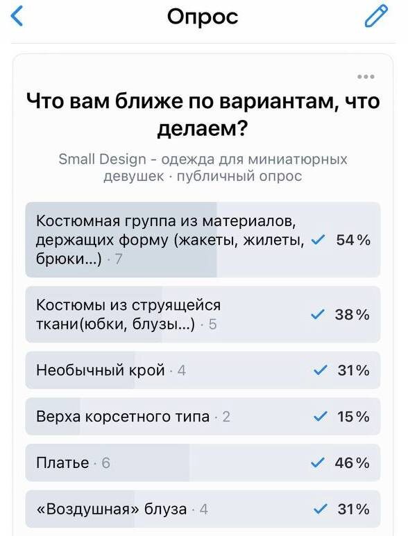 Спасибо всем, кто поучаствовал в опросе про идеи нарядных моделей ❤️ Больше всего голосов за костюмы из формодержащих тканей и платья. Второе место делят костюмы из струящейся ткани и необычный крой. Мы вас услышали и нацелились на разработку этих позиций 🤗 Примемся за работу уже в январе с прицелом выпустить к концу апреля — началу мая. Показывать процесс?