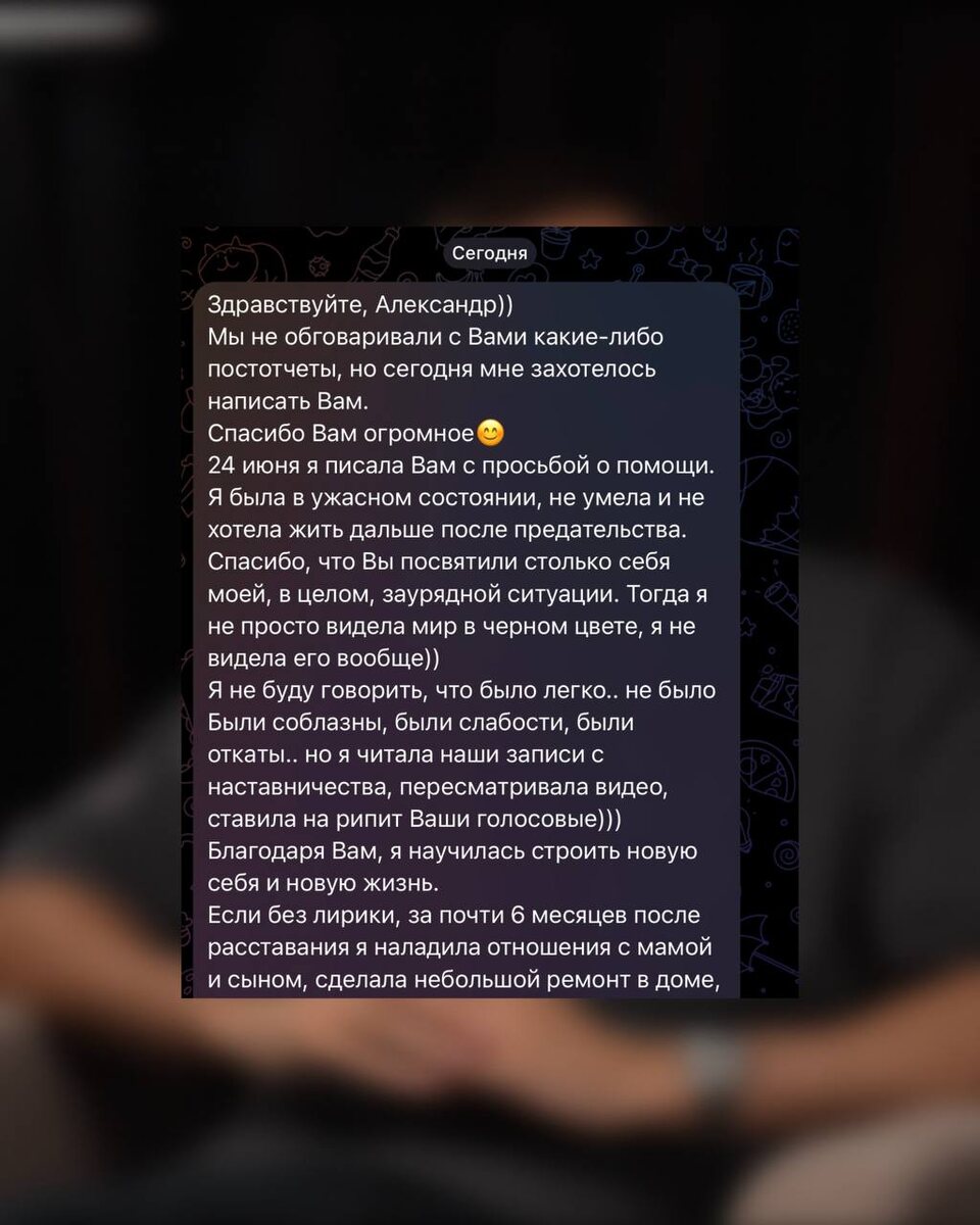 Из депрессии в новую жизнь Как-то пару лет назад я проходил обучение по ведению блога. Мне там дали инсайт, который мне тяжело было понять 💭 Звучал он примерно так: «Трудись ради благодарных отзывов людей» Когда ты работаешь ради пользы для людей, чтобы им стало проще - всё понятно, но вот чтобы ради отзывов.. Потом я понял, что если ты помог человеку, то вероятно он захочет тебе об этом рассказать 📝 Обратная связь выше - от клиентки, которая была на наставничестве 5 месяцев назад с беспросветной болью после расставания Глядя на неё я думал: «Тут будет очень тяжело» - и вот вчера пришло такое сообщение Я рекомендую прочитать его тем, кто потерял веру в себя и решил сдаться. Не всё так плохо, даже если вам сейчас больно и тяжело #отзывы