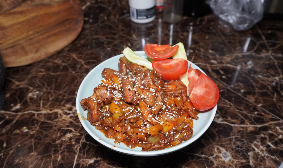 Бедро индейки с овощами! Простой и вкусный #рецепт Ингредиенты: ≈700 г. мякоть бедра индейки 6-7 болгарских перца 2 луковицы ≈30 мл соевого соуса 1 ч.л. Абхазской аджики 1 ч.л. меда 3-4 зуб. чеснока Специи: соль, чёрный перец, сушеный базилик, копченая паприка Приготовление: 1. Для начала нарезаем бедро индейки на небольшие куски, мелко нарезаем лук и произвольно полукольцами нарезаем болгарский перец, мелко шинкуем чеснок; 2. На раскаленной с маслом сковороде обжариваем бедро индейки, как лишняя влага ушла, добавляем лук, как лук обжарится, добавляем болгарский перец и чеснок, пару минут обжариваем и добавляем все специи (соль, чёрный перец, сушеный базилик, копченая паприка, соевый соус, мед, абхазскую аджику), перемешиваем и тушим 5-10 минут на медленном огне, затем ставим максимальный огонь и выпариваем лишнюю влагу! И всё! Бедро индейки готово! Приятного аппетита, мои друзья! подписывайтесь на канал, здесь будет еще много вкусных рецептов! #индейка #рецепты #рецепт #какприготовить