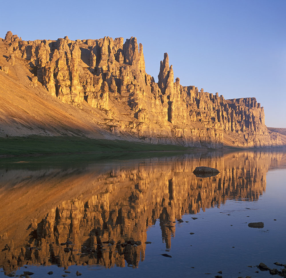 Наш проект, конечно, не мог обойти стороной такой интересный, первозданный и практически не тронутый фотографами ландшафтный объект, несмотря на крайне сложную транспортную логистику. В ходе исследований на эту тему, были проведены две фото-экспедиции в верхней части реки. Первая, с вертолётной заброской от аэропорта Полярный на реку Алакит, правый приток Оленька состоялась в 2018-м году. По Алактиту потом вышли в сам Оленек, и дошли до посёлка Оленёк на катамаранах. Эта экспедиция заняла месяц по времени. Вторая фото-экспедиция была больше похожа на обычный фототур в пределах десяти дней, состоялась в 2020-м году. Здесь мы поднялись на моторных лодках от посёлка Оленёк к скальным локациям, где смогли провести полноценную фотосъёмку. Затем, пришло время нижнего течения реки. Здесь всё сложнее. От посёлка Оленёк до посёлка Таймылыр по реке 1400 километров и в промежутке нет никаких населённых пунктов. Пришлось организовать настоящую экспедицию в 2022-м году. В зимний период завезли в посёлок Оленёк, не имеющий круглогодичное автомобильное сообщение с внешним миром, всё необходимое снаряжение и продукты. К лету сформировалась команда из девяти человек, и в таком составе мы прошли этот маршрут, длиной 1400 километров, на катамаранах с моторами. Длительность фото-экспедиции составила пять недель, и нам удалось достаточно подробно отснять все останцовые комплексы по нижнему течению реки. Теперь Оленёк достаточно подробно фотографически описан.