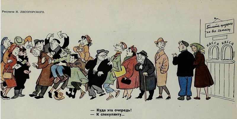 Наум Лисогорский (1910—1986). «— Куда эта очередь? — К спекулянту...». На кассе объявление: «Билеты проданы на все сеансы»