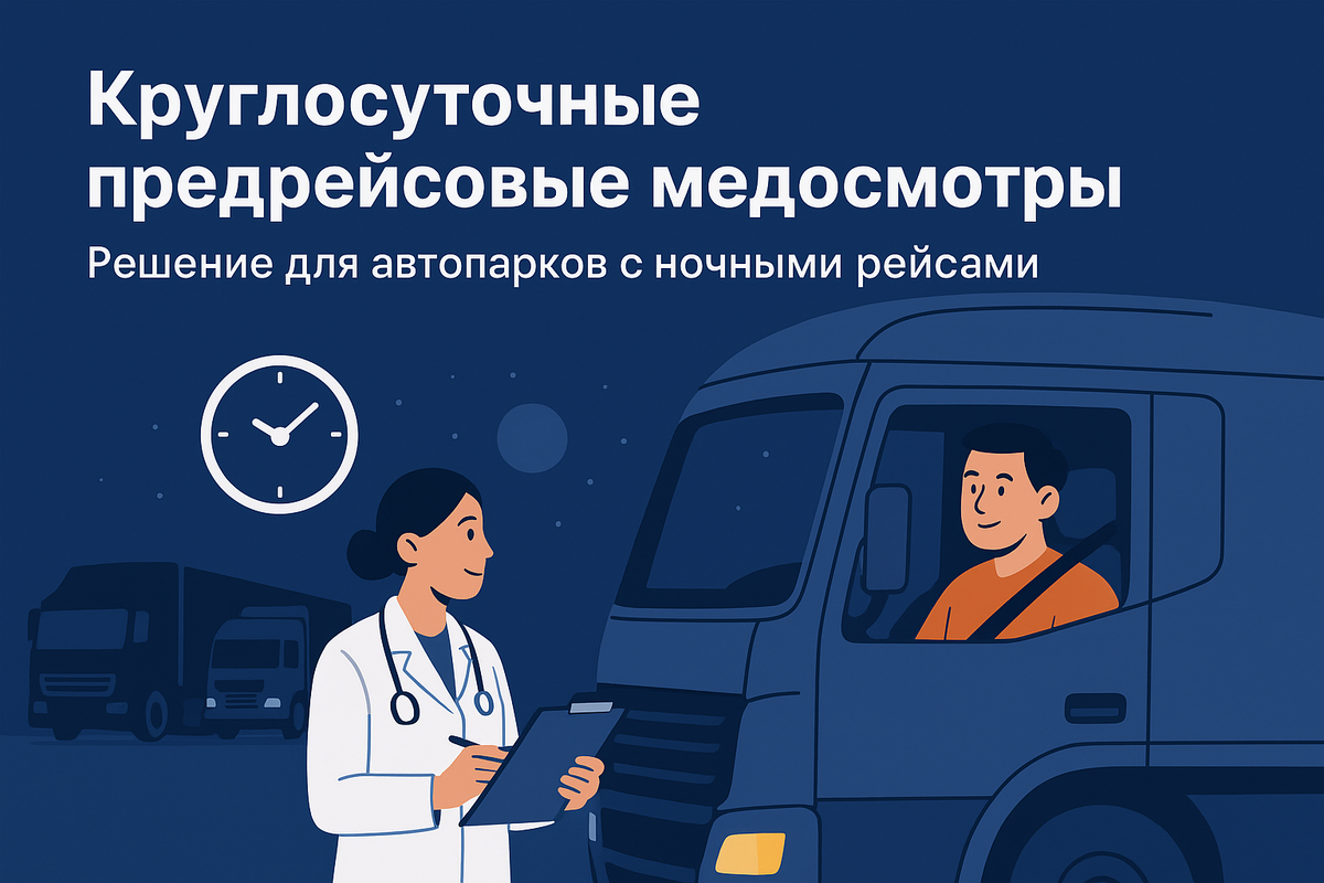 Оптимизируйте логистику без перерывов: медицинское сопровождение вашего автопарка 24/7. В современной транспортной логистике время — критический ресурс. Графики доставки становятся плотнее, а маршруты часто предполагают выезд в ночное время. В таких условиях стандартный рабочий день медпункта с 9 до 18 становится серьезным ограничением, создавая простой техники и водителей. Компания «СоюзМедТранс» предлагает стратегическое решение для динамичных автопарков — организацию круглосуточного предрейсового медицинского осмотра на вашей территории. Почему ночной и круглосуточный осмотр — не просто удобство, а необходимость? Бесперебойность логистических процессов. Выезд в рейс в 4 утра или возвращение под загрузку в полночь больше не проблема. Наш медицинский работник будет на месте точно к назначенному времени, обеспечивая соблюдение Приказа Минздрава № 835н без задержек. Повышение безопасности. Усталость, недосып, невыявленные недомогания — факторы риска, особенно проявляющиеся в ночные ча