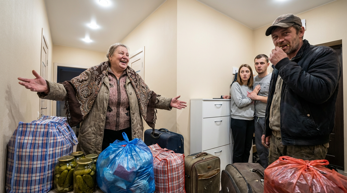 Через десять минут кухня, которая была гордостью Ольги – светлая, с бежевыми фасадами и идеально чистой плитой, – превратилась в филиал вокзального буфета. На столе громоздились банки с солеными огурцами, шмат сала, завернутый в газету, и пакет с пряниками, которые выглядели так, словно ими можно забивать гвозди.