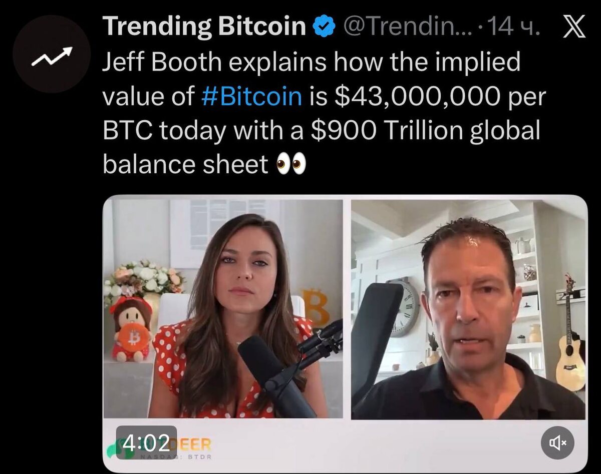 Джефф Бут объясняет, почему предполагаемая стоимость #Bitcoin сегодня составляет 43 000 000 долларов за BTC при мировом балансе в 900 триллионов долларов 👀