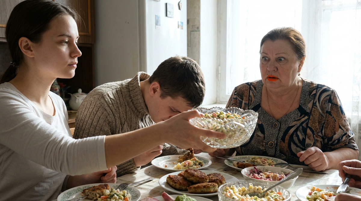 Галина Сергеевна не взяла салатницу сразу. Она демонстративно поджала губы, накрашенные яркой морковной помадой, и окинула невестку взглядом, в котором читалось оскорбленное достоинство.