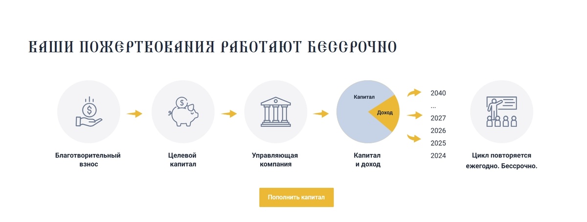Мы хотели бы рассказать вам о созданной фондом «Свете Тихий» некоммерческой организации «Специализированный фонд управления целевым капиталом для социальной помощи семьям духовенства». Что такое фонд целевого капитала? Фонд целевого капитала или эндаумент-фонд — это то имущество некоммерческой организации, которое формируется за счёт пожертвований физических и юридических лиц. Пожертвования инвестируются, а не расходуются на текущие задачи, создавая таким образом «подушку безопасности». Это необходимо для планирования долгосрочных проектов и постоянного развития. Инвестиционный доход от созданного фонда целевого капитала призван обеспечить финансовую независимость фонда «Свете Тихий» для оказания стабильной и непрерывной материальной помощи нуждающимся семьям священнослужителей Русской Православной Церкви. У нашего фонда целевого капитала есть отдельно созданный сайт. В разделе пополнения капитала, вы можете по велению сердца совершить пожертвование в пользу фонда целевого капитала. К