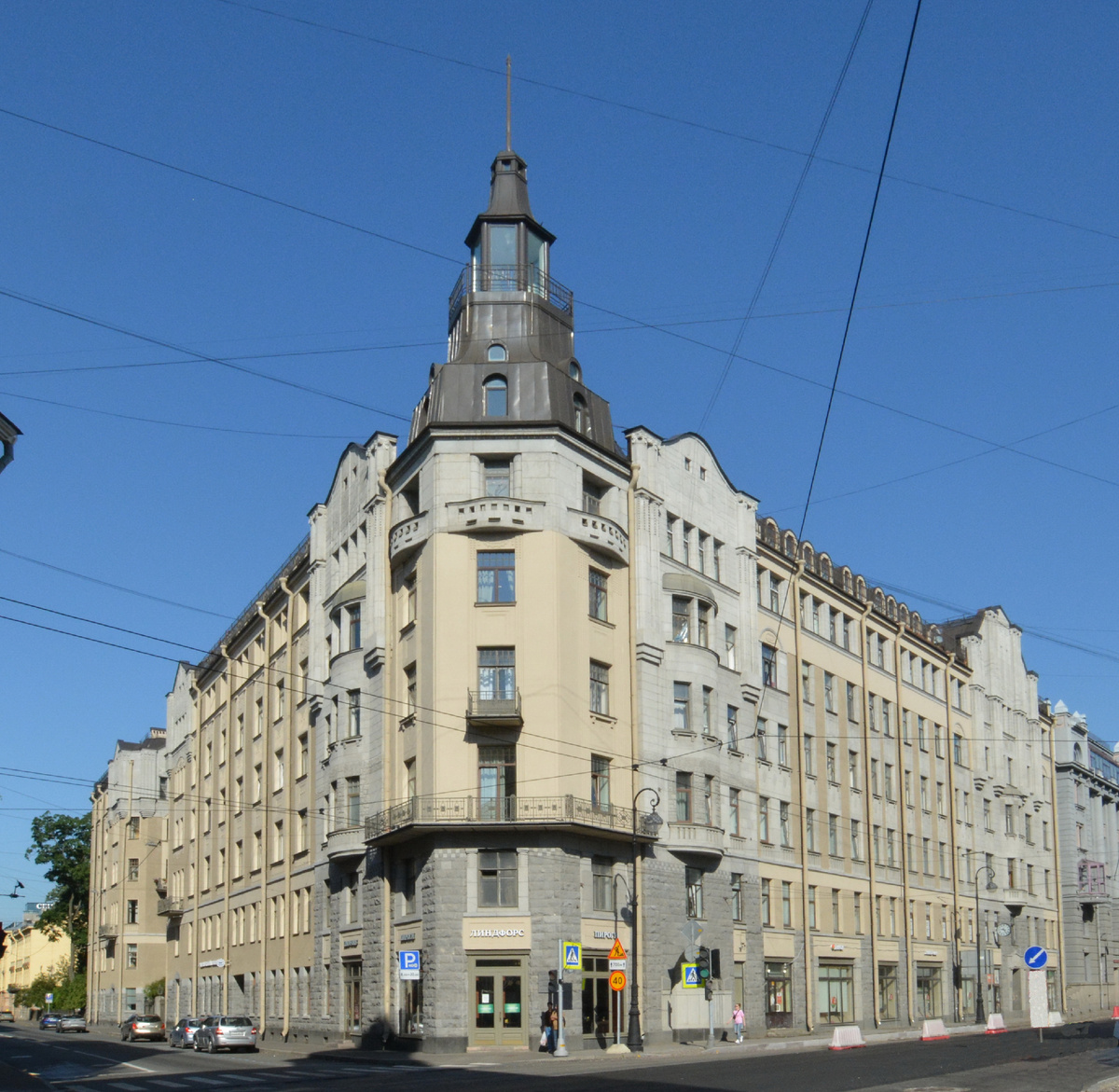 Для тех, кто не читал предыдущие статьи этой серии, напомню, что слово «курдонёр» – это русифицированное французское словосочетание «cour d'honneur», которое дословно переводится как «двор чести». Правильнее будет перевести его как «парадный двор». Курдонёром называют двор, открытый со стороны улицы, чаще всего имеющий форму прямоугольника, расположенного перпендикулярно улице. Фасады, выходящие в курдонёр, обычно имеют парадную отделку и декор, такие же, как фасады, расположенные на красной линии. Дом Берштейна стоит на углу Каменноостровского проспекта и улицы Профессора Попова (до 1940 года Песочная улица). Дом построил в 1911 году архитектор Крыжановский по заказу купца 1-й гильдии Р.И.Берштейна. Дмитрий Андреевич Крыжановский приехал в Петербург из Иркутска, закончил Академию художеств, построил в Петербурге – Ленинграде более сотни домов, в основном на Петроградской стороне. Около 20 его домов признаны теперь памятниками архитектуры. Дмитрий Андреевич умер от голода в блокадном