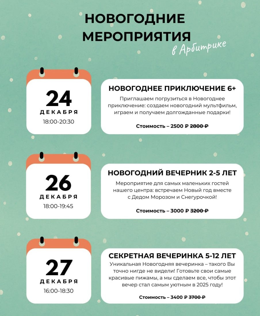 Осталось 2 дня... До повышения цен 😭 Успейте приобрести билеты на Новогодние мероприятия по выгодным ценам 👇 ❄️ НОВОГОДНЕЕ ПРИКЛЮЧЕНИЕ 6+ Погружаемся в атмосферу праздника через творчество и компьютерные технологии! В программе: — Создание Новогоднего мультфильма — Погружение в мир 3Д-моделирования и игр — Вкусные угощения и приятные подарки! ⏰ 24 декабря в 18:00 🔥 Специальная цена до 17 декабря — 2500₽ 2800₽🔥 ❄️ НОВОГОДНИЙ ВЕЧЕРНИК 2+ ❄️ Встречаем Новый год вместе с Дедом Морозом и Снегурочкой! В программе: — Интерактив от Деда Мороза и Снегурочки — Творческая Новогодняя поделка — Вкусные угощения и приятные подарки! ⏰ 26 декабря в 18:00 🔥 Специальная цена до 17 декабря — 3000₽ 3200₽🔥 🌲 СЕКРЕТНАЯ ВЕЧЕРИНКА 3-12 лет Готовьте свои самые красивые пижамы, а мы сделаем все, чтобы этот вечер стал самым уютным в 2025 году! В программе: — Уникальный мастер-класс и Зимняя сказка — Просмотр мультфильма и сказочная атмосфера — Подведение итогов 2025 года и несколько секретных активн